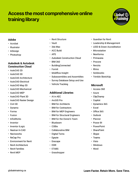 Covers Varied Skill Levels Not to worty with Global eTraining’s comprehensive training library since they offer courses to match every skill and experience level, ranging from beginner to expert. This comprehensive approach enables more advanced learners to fine-tune skills and stay up-to-date on the latest software versions, while those with less experience can GeT up to speed quickly.