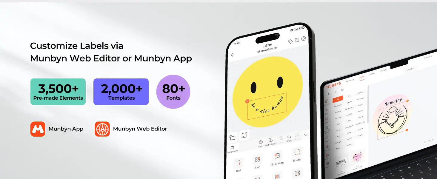 • Customize labels for any occasion: With MUNBYN Bluetooth label printer, access 3,500+ elements, 2,000+ templates, and 80+ fonts. Import PDFs/TXTs or use OCR for text recognition. Enjoy multi-language support across platforms. Download 'MUNBYN Print' for mobile and tablet, or visit the online 'Munbyn editor' for laptop and desktop